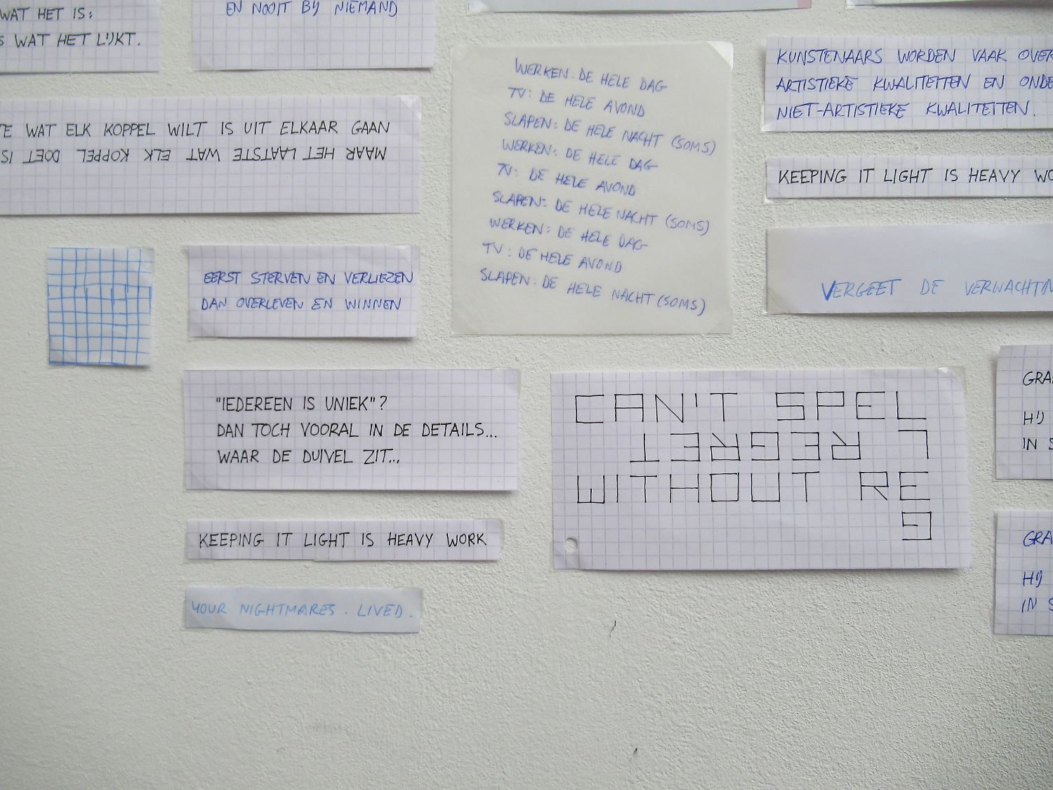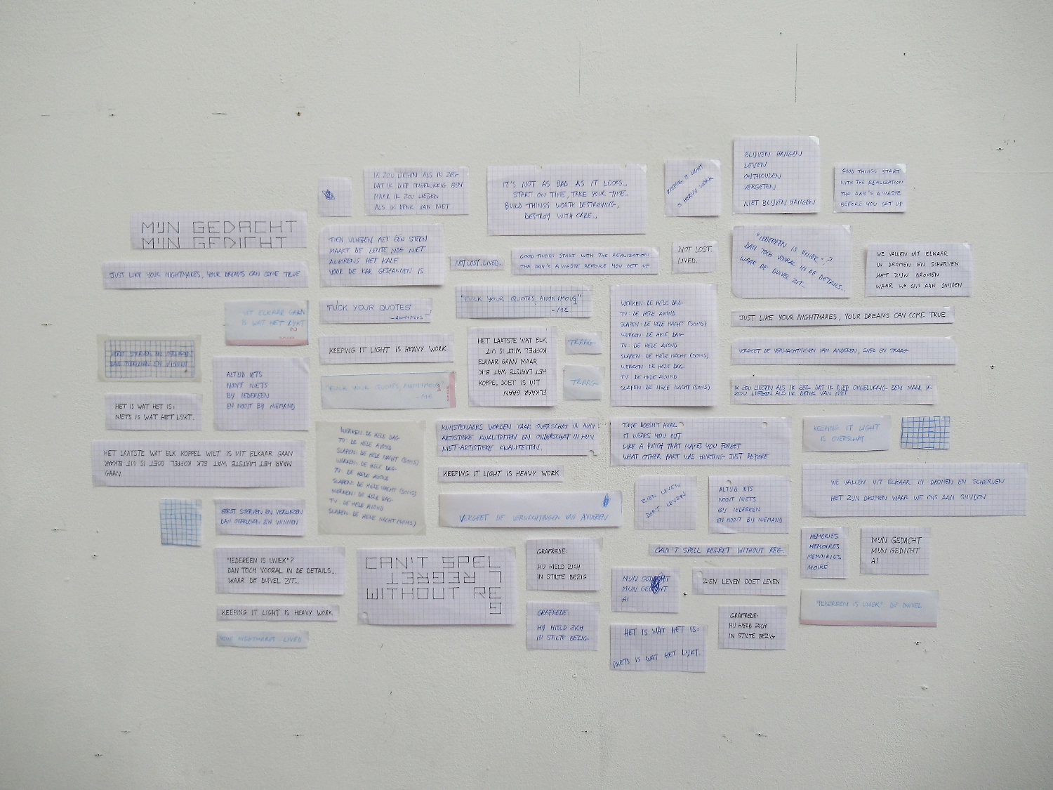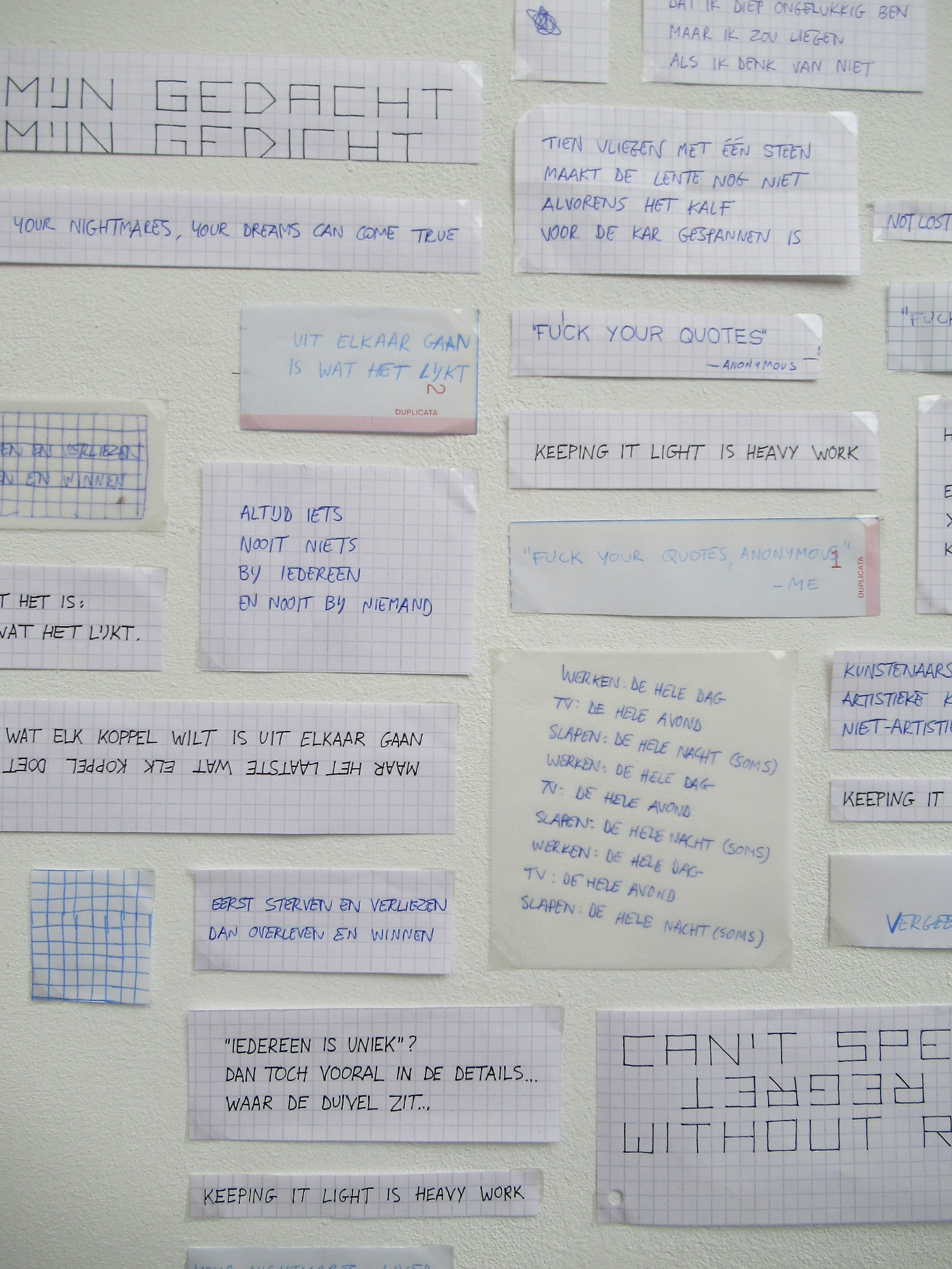 Niet al deze geschriften laten zich even goed vertalen naar hetzelfde medium. Sommige zijn misschien geschikt voor posters, andere voor een boekje en weer andere misschien voor voordracht. Het object uit het Stasi-museum diende als katalysator en zette me ertoe aan om alles met de hand op aparte stukjes ruitjespapier te schrijven.