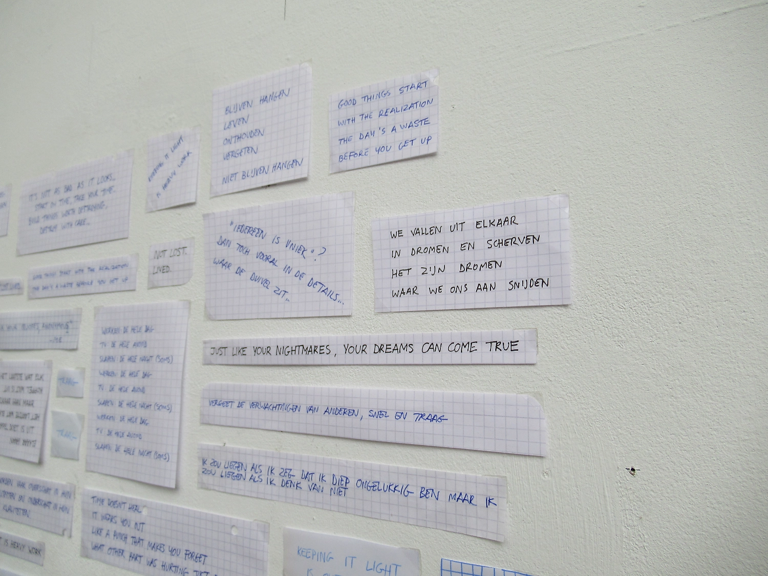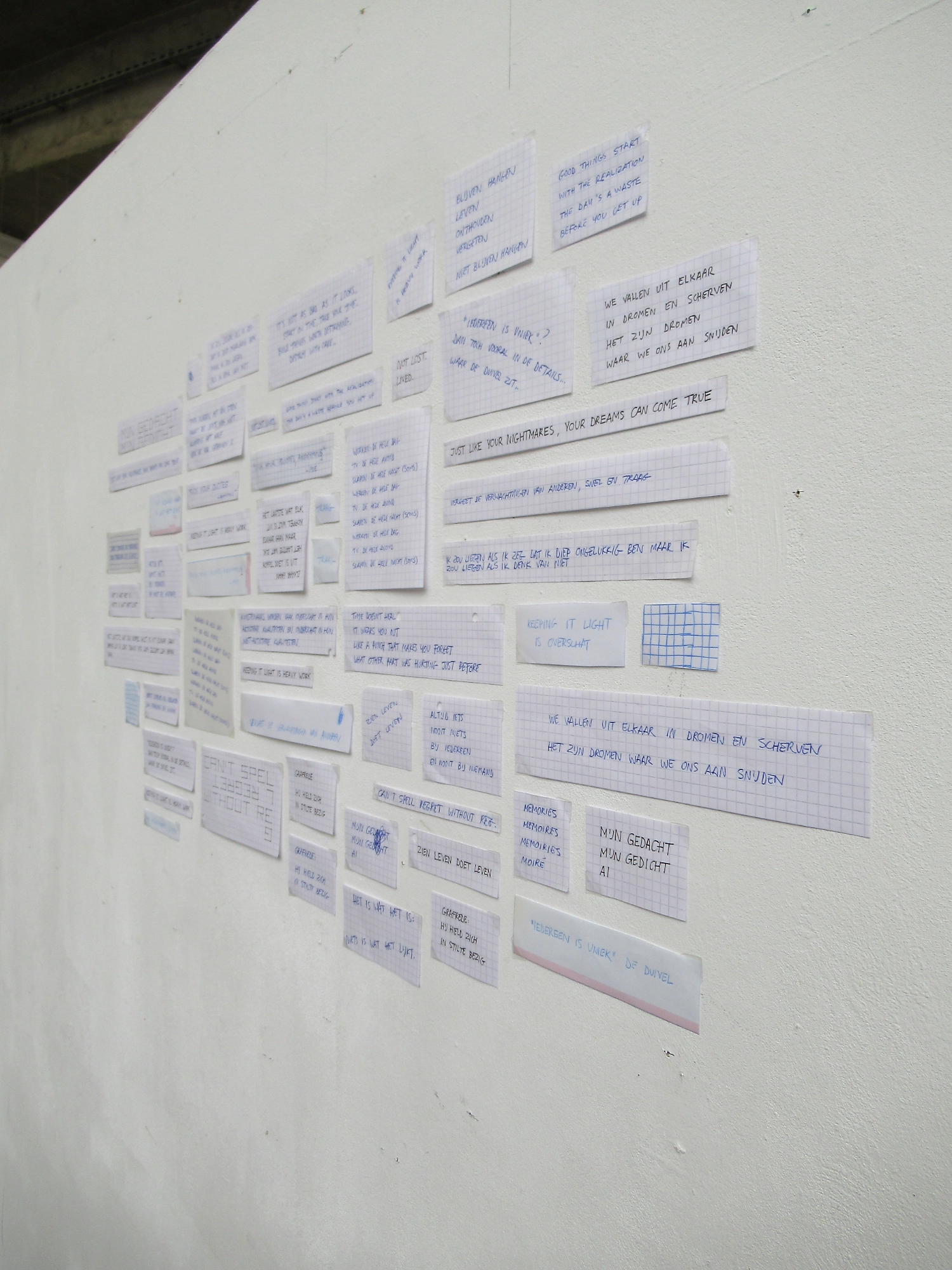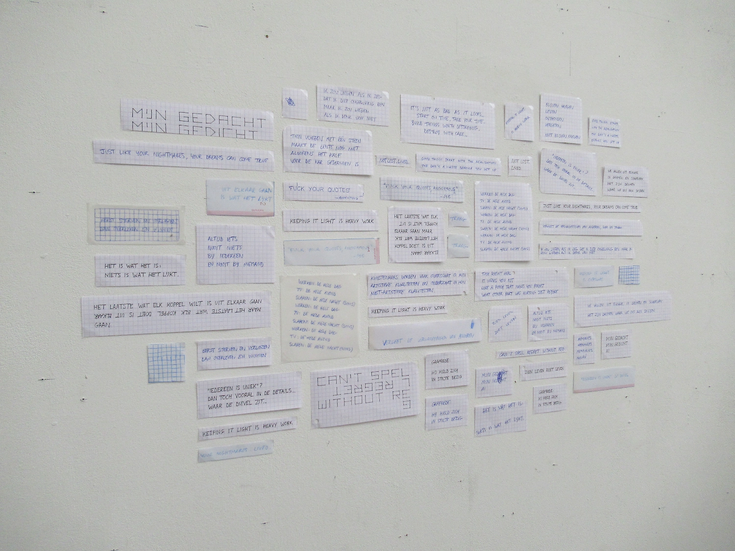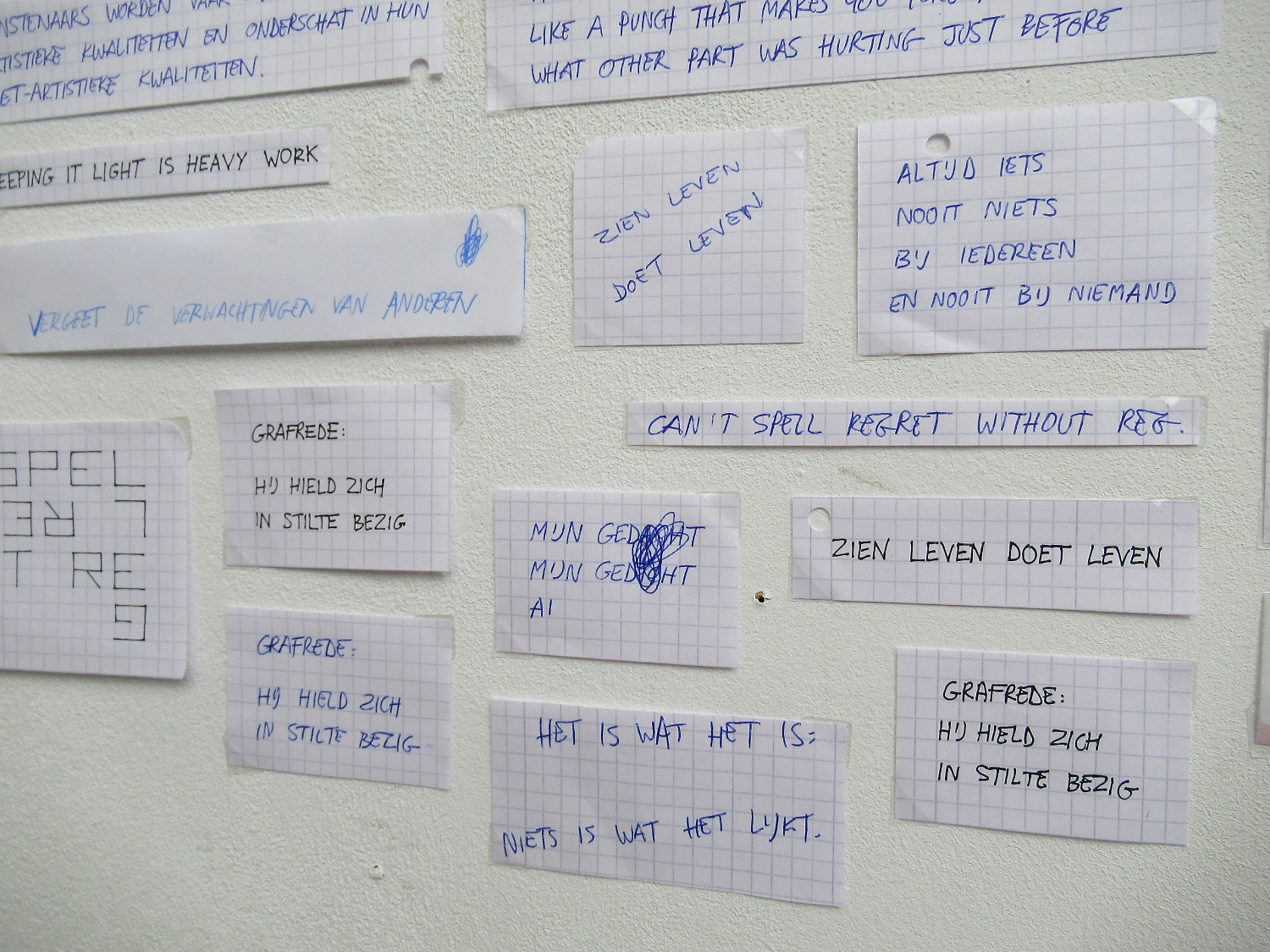 Niet al deze geschriften laten zich even goed vertalen naar hetzelfde medium. Sommige zijn misschien geschikt voor posters, andere voor een boekje en weer andere misschien voor voordracht. Het object uit het Stasi-museum diende als katalysator en zette me ertoe aan om alles met de hand op aparte stukjes ruitjespapier te schrijven.